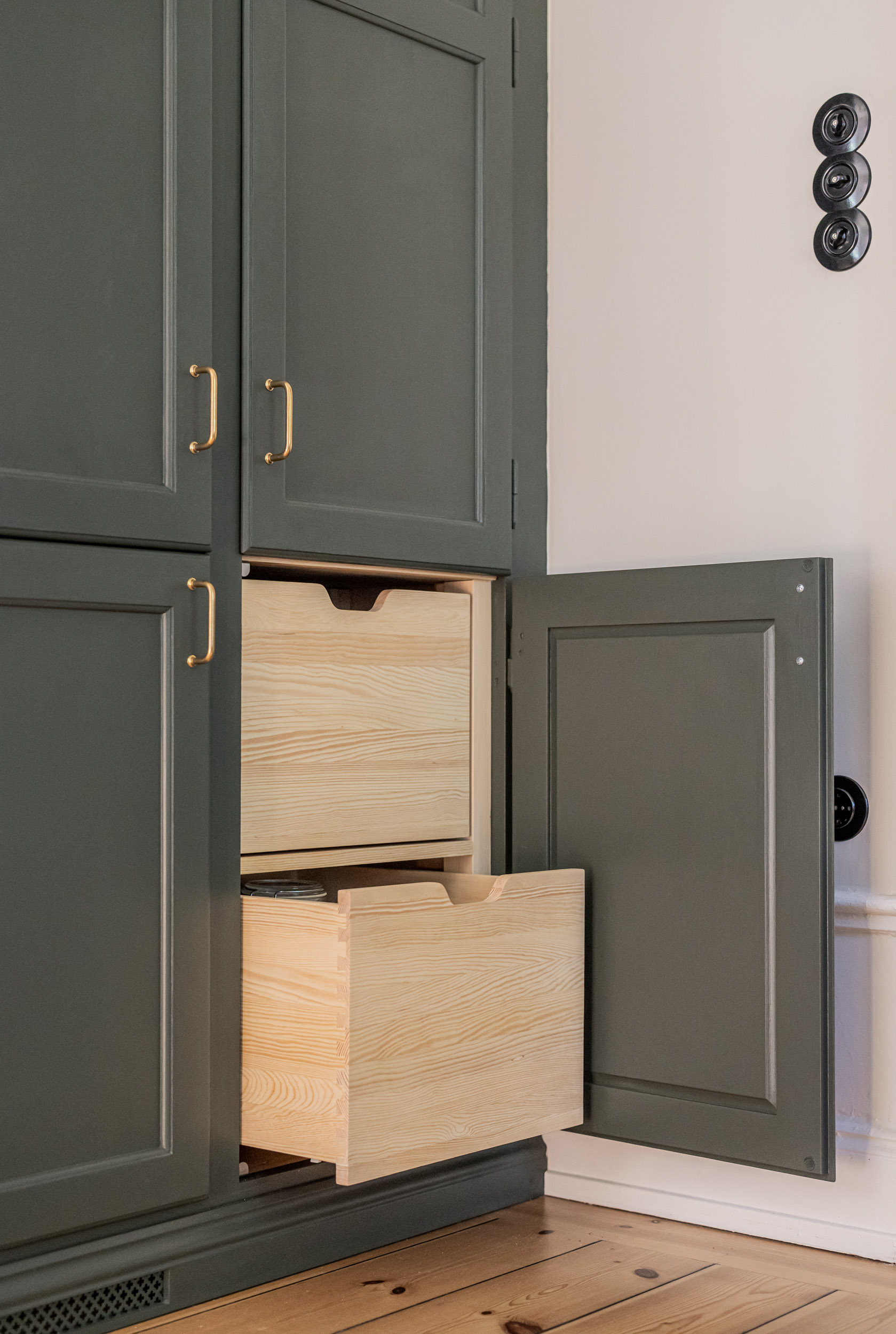 Cabinette är vår kurerade kollektion för hemmets olika rum – hall, badrum, tvättstuga, garderob och även kök. Serien bygger på samma grundprinciper som våra kök: massivt trä och handmålning med linoljefärg.