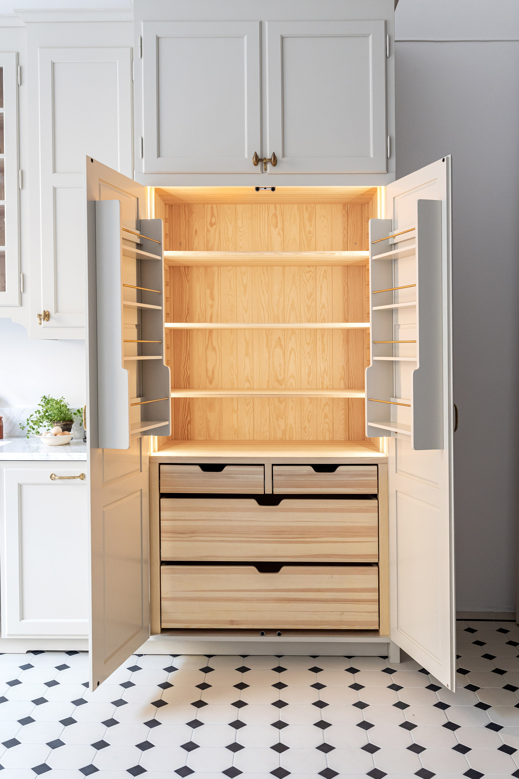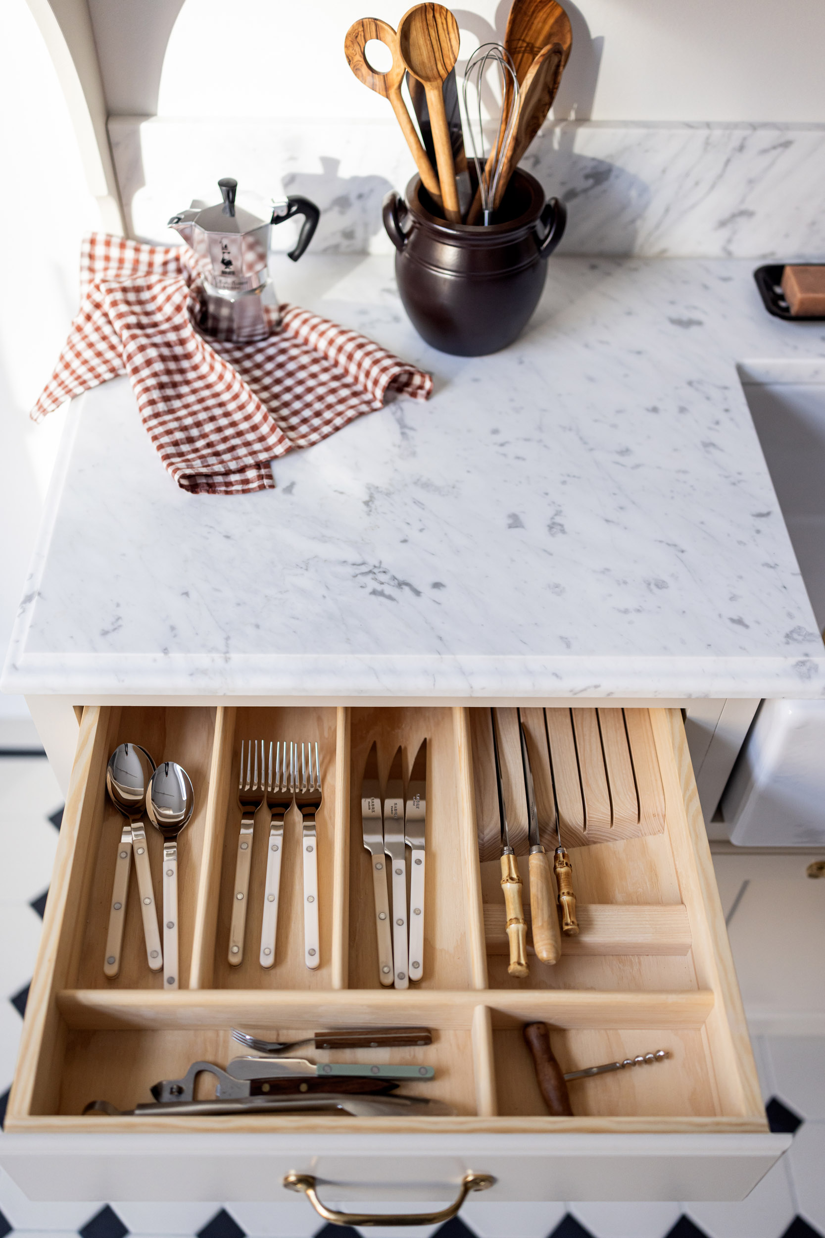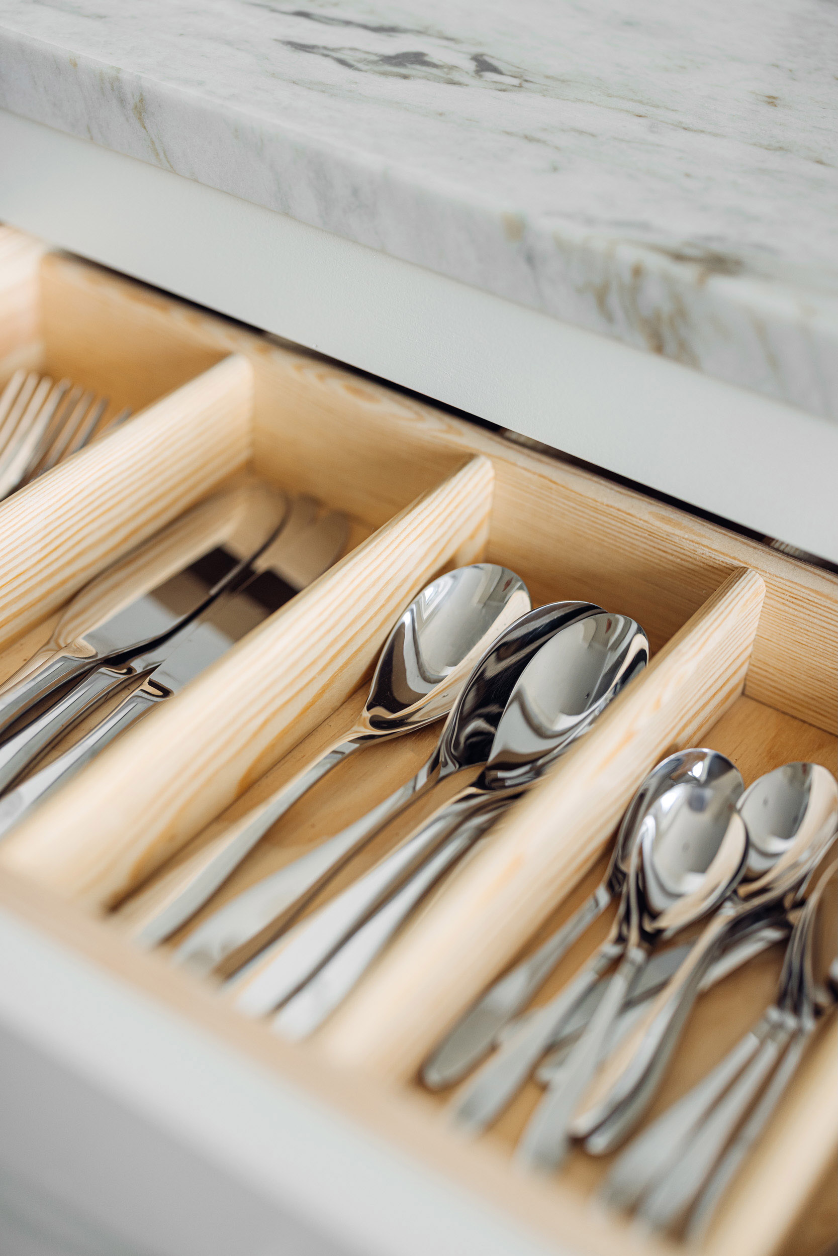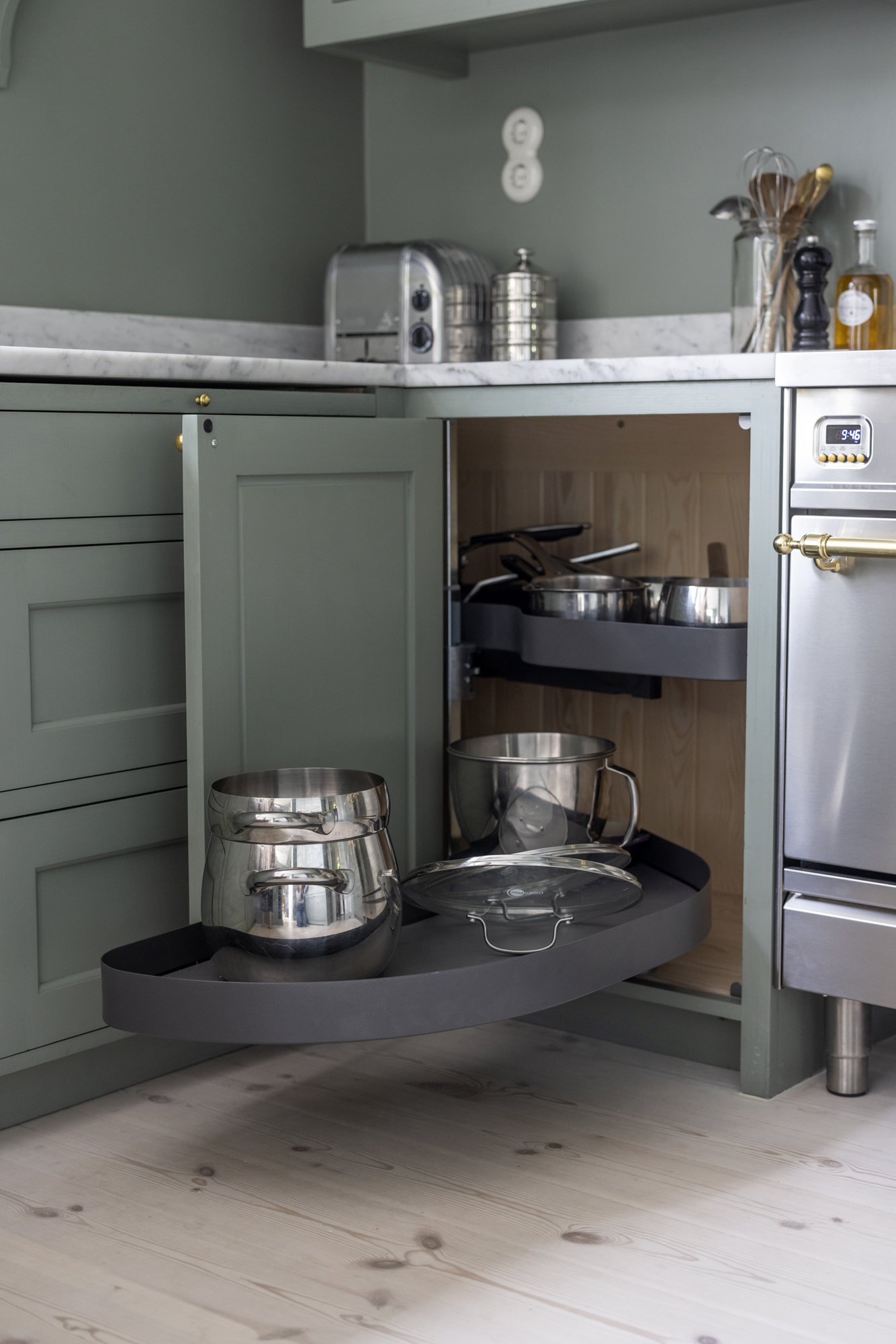 Du kan komplettera med både vacker och praktisk utrustning, som måttanpassade bestickinsatser, utdragslådor i trä och infälld belysning. Luckor kan förses med vitringlas och skåp kan få invändig belysning. Väggskåpen kan utrustas med ställbara hyllplan, och för ett mer klassiskt uttryck finns möjlighet till dekorativa inslag som snickarglädje och konsoler.
