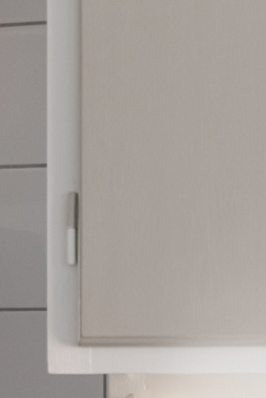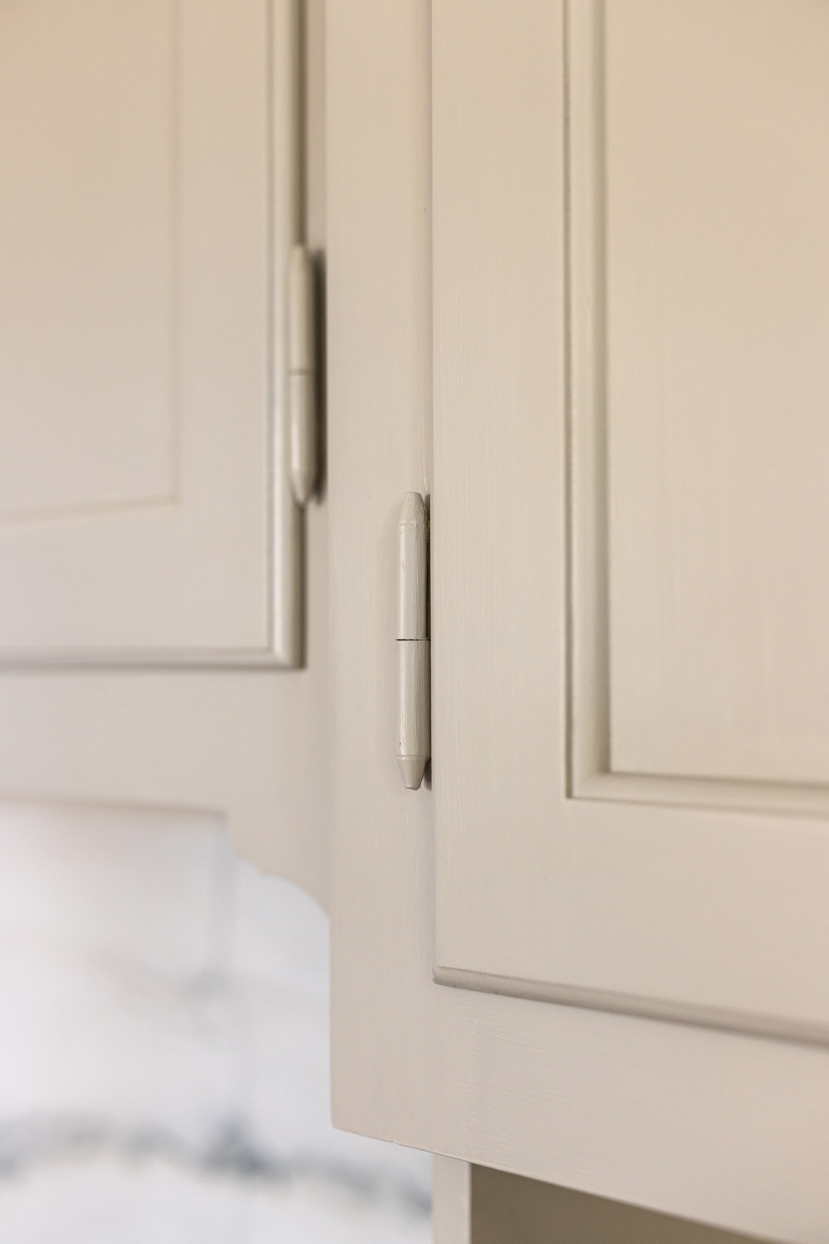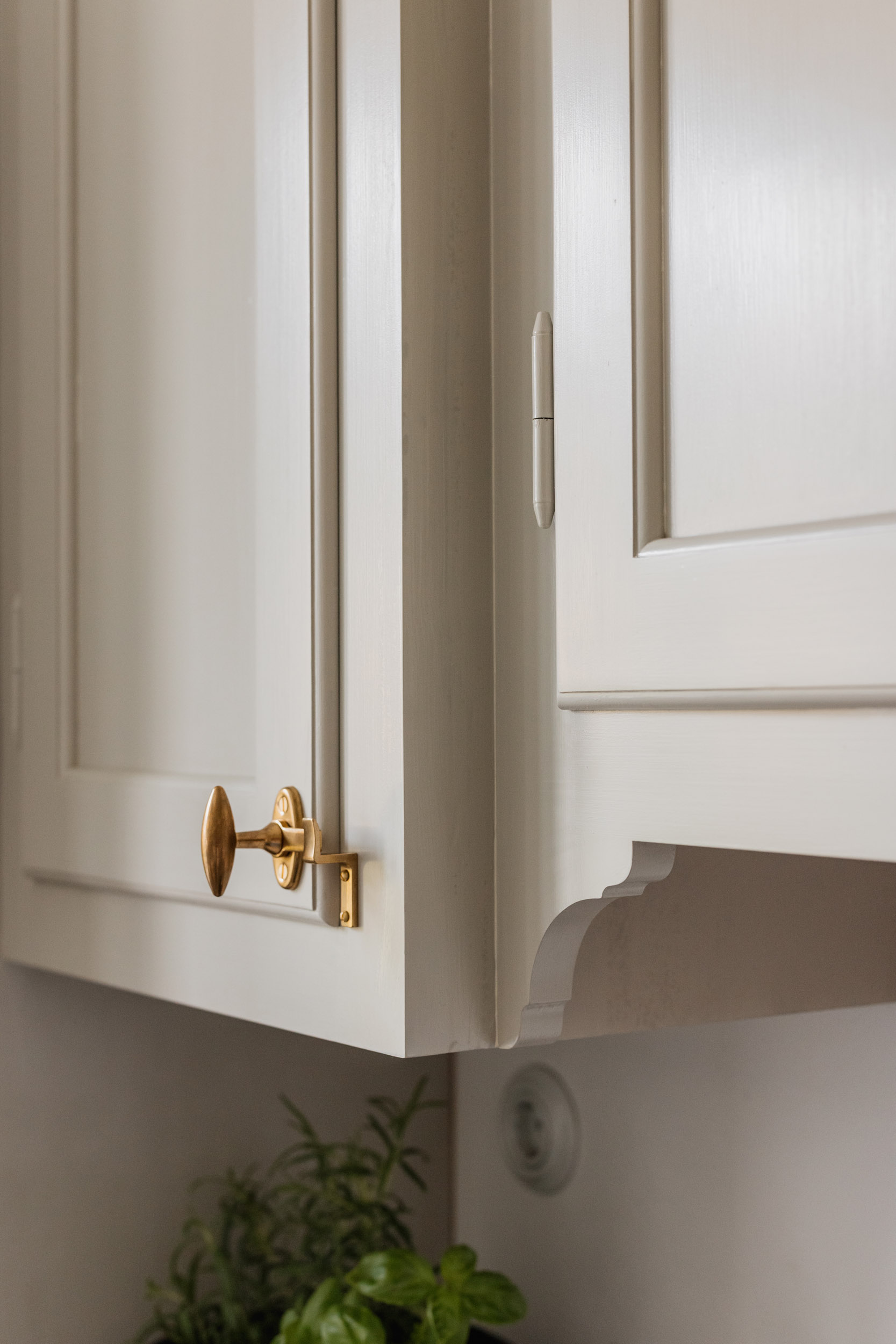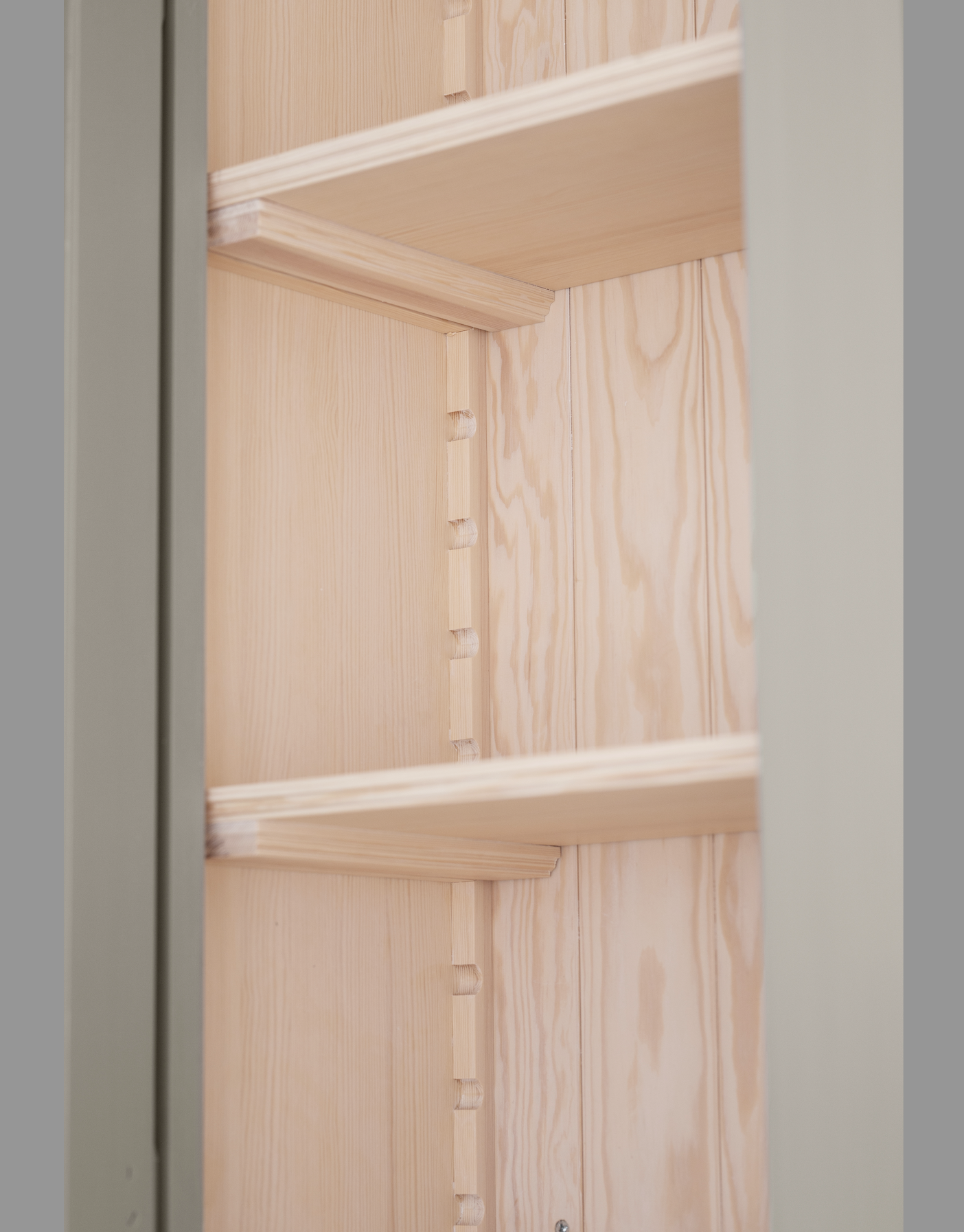 Gångjärn av obehandlat stål, som målas i samma färg som skåpen. Samma modell som används i Sverige sedan 1800-talet.